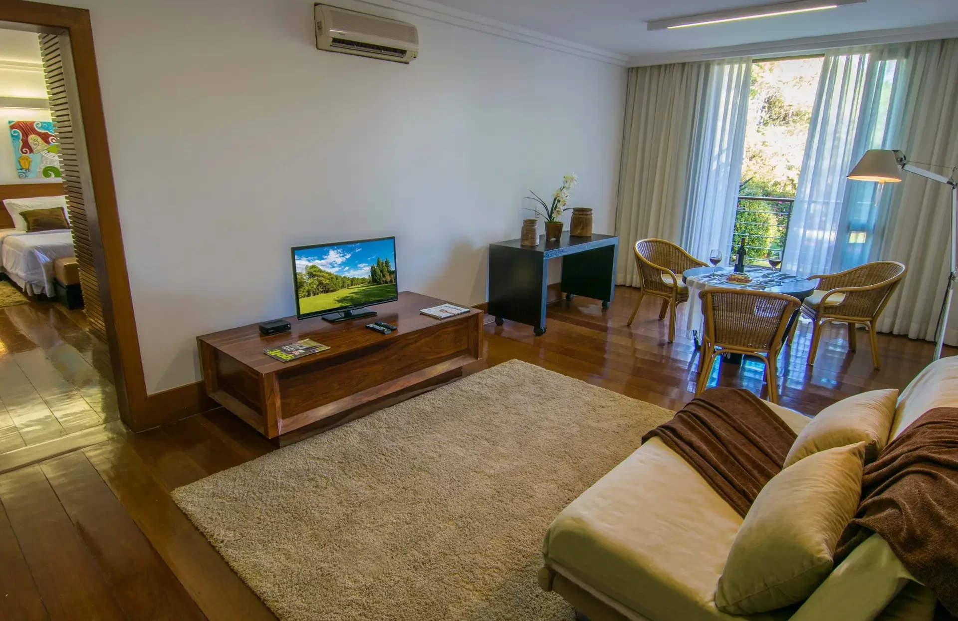 Uma luxuosa suíte de 65m², cuidadosamente dividida em dois ambientes que traduzem requinte e conforto. A ampla sala de estar e a mesa de refeições proporcionam momentos de relaxamento e conveniência, enquanto as varandas revelam uma vista deslumbrante para o campo de golfe.